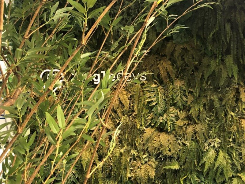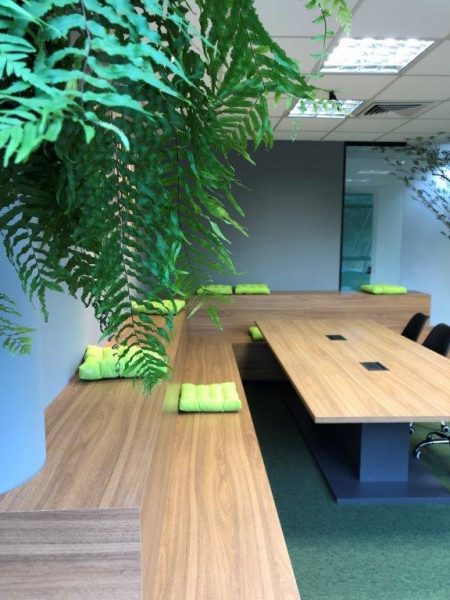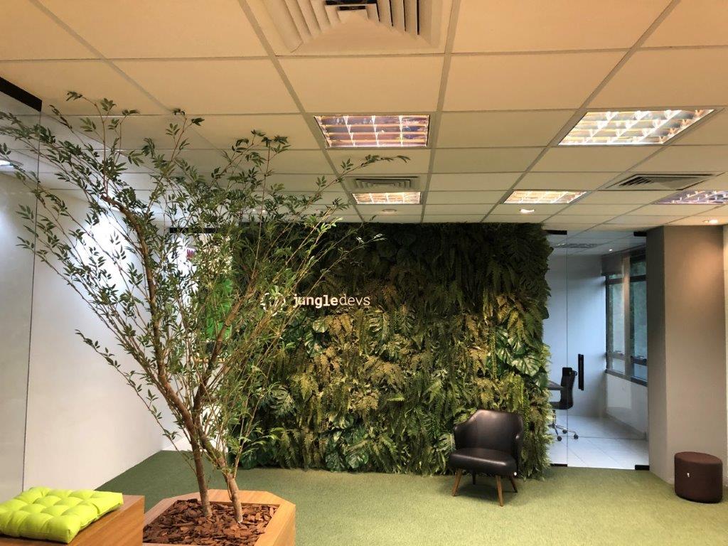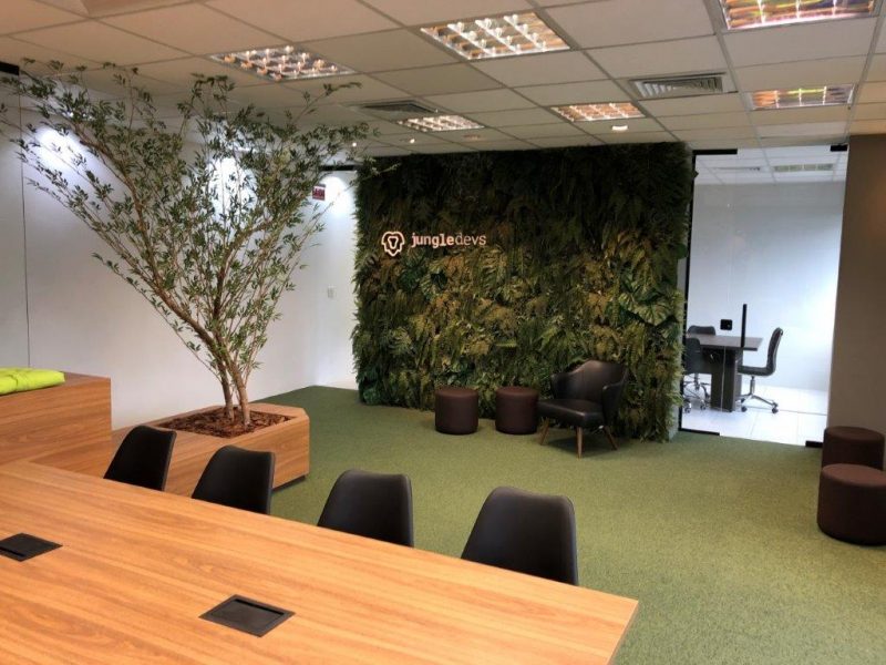 Neste projeto, os elementos arquitetônicos combinaram com excelente resultado a madeira do mobiliário, o verde do carpete e os elementos de vegetação, dando corpo à identidade da JungleDev. As plantas artificiais que permeiam o espaço e as samambaias (de verdade!) que enfeitam a recepção são do Primavera Garden.