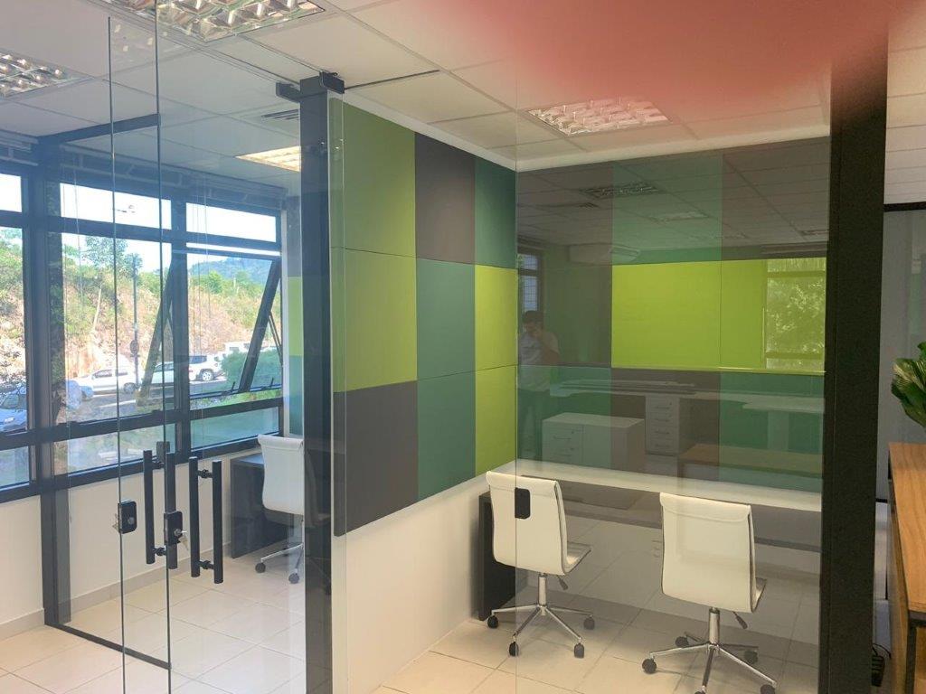 O ambiente conta ainda com projetor com tela retrátil e uma parede inteira de vidro branco, que fornece espaço para anotações.